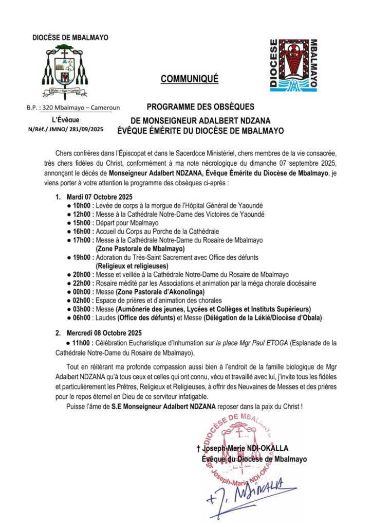 L’Église qui est au Cameroun traverse une nouvelle épreuve de foi et d’espérance avec le rappel à Dieu de Son Excellence Monseigneur Adalbert Ndzana, Évêque Émérite du Diocèse de Mbalmayo. Le programme des obsèques, qui s’achèvera le mercredi 8 octobre 2025, s’annonce comme une célébration, empreinte de recueillement et de reconnaissance. À travers cet événement, l’épiscopat camerounais, les prêtres, religieux, religieuses et fidèles laïcs du diocèse de Mbalmayo, en union avec l’Église universelle, sont invités à se rassembler dans la prière et à témoigner de leur proximité fraternelle.